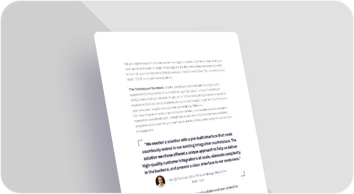 like your app because it looks like a whole new page or renders in a different style. When your users perceive they are no longer in your app, it naturally creates a bad user experience. Not to mention, your competitors will happily use your product’s poor UX as “fear, uncertainty, and doubt” (FUD) in competitive evaluations. “The Tech Support Takedown.” Another painful avenue for activation is a high-touch experience that requires too much hand-holding to get up and running. Think detailed configuration, tracing error codes in logs, and client services getting involved. An activation experience that’s too complicated requires calls to tech support to get working. As a result, your resources, margins, and customer satisfaction all take a hit. For many integration vendors, providing an embedded, customizable end user activation experience is an afterthought. Instead, ensure your vendor has invested in an embedded integration experience that your team can customize, embed, and is simple for your end user to engage with. “We needed a solution with a pre-built interface that could seamlessly embed in our existing integration marketplace. The solution we chose offered a unique approach to help us deliver high-quality customer integrations at scale, eliminate complexity in the backend, and present a clean interface to our customers.” — Martijn Russchen, Senior Product Manager, HackerOne Learn more What to look for to deliver a robust and scalable end user activation experience Complete set of APIs to list all Complete set of APIs to list all When a user heads to your integration marketplace, or the integration page in available integrations withinavailable integrations within your app, you’ll need the vendor’s APIs to query the integrations that are yyour appour app available and present in your UX Easy for developers to publish new integrations to your app or marketplace Don’t settle for “code-it-yourself” or simply an IFrame embed of a solution’s standard builder—look for an integration component designed for end users to activateparameterized integration templates, in-product. 11