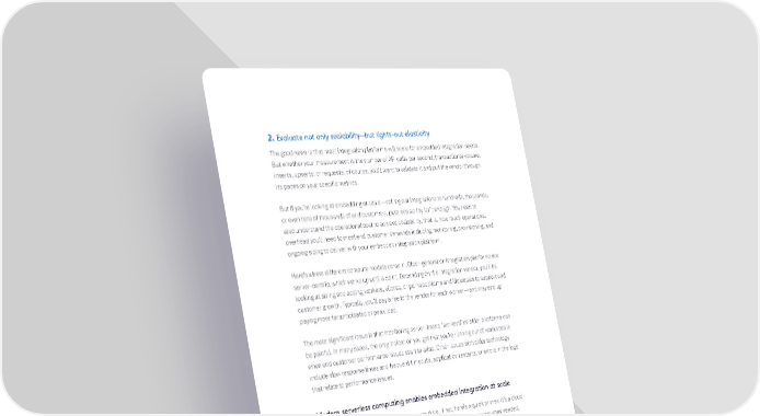 2. Evaluate not only scalability—but lights-out elasticity The good news is that most integration platforms will scale for embedded integration needs. But whether your measurement is the number of API calls per second, transactional volume, inserts, upserts, or requests, of course, you’ll want to validate it and put the vendor through its paces on your specific metrics. But if you’re looking at embedding at scale—rolling out integrations to hundreds, thousands, or even tens of thousands of end customers, pure scalability isn’t enough. You need to also understand the operational cost to achieve scalability, that is, how much operational overhead you’ll need to meet end customer demands including monitoring, provisioning, and ongoing sizing to deliver with your embedded integration platform. Here’s where different compute models come in. Older-generation integration platforms are server-centric, which works up until a point. Depending on the integration vendor, you’ll be looking at sizing and adding workers, vCores, or perhaps Atoms and Molecules to support end customer growth. Typically, you’ll pay a fee to the vendor for each worker—and may end up paying more for anticipated or peak load. The more significant issue is that monitoring server-based “workers” on older platforms can be painful. In many cases, the only indication you get that you’re running out of resources is when end customer performance issues start to arise. Other issues with older technology include slow response times and frequent timeouts, application restarts, or errors in the logs that relate to performance issues. Modern serverless computing enables embedded integration at scale You’re probably familiar with serverless computing. If not, here’s a quick primer: It’s a cloud computing model where the provider dynamically allocates the exact resources needed, on-demand. In a true serverless architecture for an embedded integration platform, each step or task in an integration flow (such as a trigger, transformation, or insert) is a serverless function. Serverless architecture elastically allocates resources on demand. Because there are no persistent workers, there’s no need to size or pay for anticipated demand. And there’s no need for your ops team to continually monitor dashboards and logs for customer issues related to under-sizing. As a result, serverless is a recipe for elasticity and end customer integrations at scale. 9