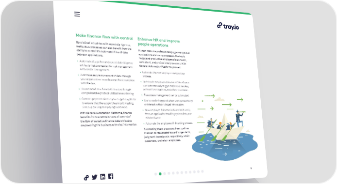 Make finance flow with control Enhance HR and improve Specialized industries with especially rigorous, people operations meticulous processes can also benefit from the Human resource professionals juggle many cloud ability to control the automated flow of data applications and many processes. The key to between applications. happy and productive employees is a smooth, • Automatically gather and consolidate diligence consistent, and professional processes. With artifacts that are needed for risk management General Automation Platforms you can: and vendor management. • Automate the new employee on-boarding • Automate secure movement of data through process. your organization in such a way that it complies • Updates to employee status in HCM software with the law. can automatically trigger credential revokes, • Recommend new financial services through account terminations, and other processes. comprehensive product utilization monitoring. • File access management can be automated. • Connect payment data to your support systems • Alerts can be triggered when employees change to ensure that the support team isn’t wasting or interact with privileged information. time supporting non-paying customers. • New employee data can be funneled directly With General Automation Platforms, finance from an application tracking system into your benefits from a central source of control of HCM software. the flow of sensitive finance data while also empowering the business with vital information. • Automate the employee off-boarding process. Automating these processes frees up time that can be reallocated toward longer-term, judgment-based goals: respectively, retain customers, and retain employees. 9