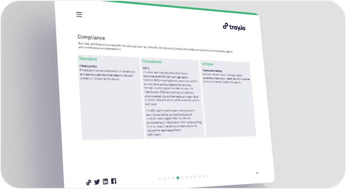 Compliance Technical certifications comply with industry standard requirements. Vendors should be able to provide a comprehensive compliance program with certifications and attestations. Standard Occasional Unique Privacy policy SOC 2 Penetration testing Privacy policies are standard for most vendors The American Institute of Certified Public A vendor can and should undergo regular and assure customers that data will be held Accountants (AICPA) Service Organization penetration testing by independent third parties privately in almost all situations. Controls (SOC) reports give assurance over control to ensure that their platform is secure. environments as they relate to the retrieval, storage, processing, and transfer of data. The reports cover IT General controls and controls around availability, confidentiality, and security of customer data and are issued for 6-month periods each year. The SOC Type 2 reports cover controls around security, availability, and confidentiality of customer data. Regular SOC 2 audits are conducted by an independent, third-party auditing firm. You should be able to contact a vendor to request the latest copy of their SOC 2 audit. 34