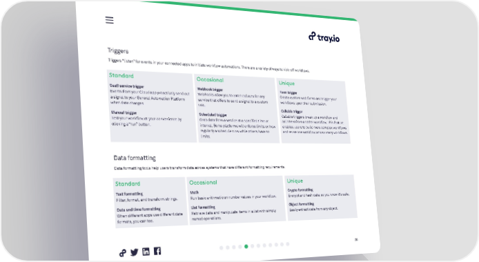 Triggers Triggers “listen” for events in your connected apps to initiate workflow automations. There are a variety of ways to kick-off workflows. Standard Occasional Unique SaaS service trigger Webhook trigger Form trigger Events from your Cloud app proactively send out Webhooks allow you to catch callouts for any Create custom web forms and trigger your a signal to your General Automation Platform service that offers to send a signal to a custom workflows upon their submission. when data changes. URL. Callable trigger Manual trigger Scheduled trigger Callable triggers break up a workflow and Test your workflow at your convenience by Grab data from a service at a specified time or call them from another workflow. This feature clicking a “run” button. interval. Some platforms will enforce limits on how enables users to build more complex workflows regularly a schedule runs while others have no and reuse one workflow across many workflows. limits. Data formatting Data formatting tools help users transform data across systems that have different formatting requirements. Standard Occasional Unique Text formatting Math Crypto formatting Filter, format, and transform strings. Run basic arithmetic on number values in your workflow. Encrypt and hash data, so you know it’s safe. Data and time formatting List formatting Object formatting When different apps use different date Retrieve data and manipulate items in a list with simply Easily extract data from any object. formats, you can too. named operations. 28