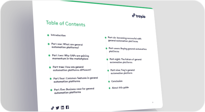 Table of Contents Introduction Part six: becoming successful with general automation platforms Part one: What are general automation platforms? Part seven: Buying general automation platforms Part two: Why GAPs are gaining momentum in the marketplace Part eight: The future of general automation platforms Part tree: How are general automation platforms different? Part nine: Tray’s general automation platform Part four: Common features in general automation platforms Conclusion Part five: Business case for general About this guide automation platforms 2