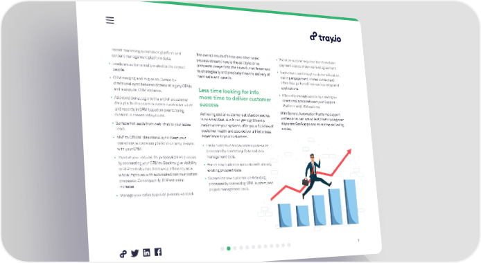 recent marketing automation platform and The overall result of these and other sales • Prioritize support requests based on client content management platform data. process streamliners is the ability to drive payment status or service level agreement. • Leads are automatically routed to the correct prospects deeper into the sales funnel faster and • Track churn can through customer utilization, people. to strategically and precisely time the delivery of waning engagement, limited contact and hard sells and upsells. other data gathered from various integrated • CRM merging and migration. Create bi- applications. directional sync between dozens of legacy CRMs Less time looking for info and a singular CRM instance. • Efficiently manage upsells by creating bi- • Add conditional logic to the end of a customer more time to deliver customer directional syncs between your Support data platform stream to create custom activities success Platform and CRM systems. and records in CRM based on events being Achieving stellar customer satisfaction scores With General Automation Platforms support created in connected systems. is no small feat. But it can get significantly professional can spend less time tripping over • Surface hot leads from web-chat to your sales easier when your systems offer you a full view of disparate SaaS apps and more time delivering team. customer health and also deliver a frictionless smiles. • MAP to CRM bi-directional sync: Keep your experience to your customers. marketing automation platform entirely in-sync • Easily customize and automate post-sales with your CRM. processes by connecting CRM and task • Improve your request for proposal (RFP) process management tools. by connecting your CRM to Slack to give visibility • Enrich new customer accounts with already to RFP contributors. Follow-up efficiency as a existing prospect data. whole improves with automated communication processes. Consequently, RFP win rates • Streamline new customer on-boarding increase. processes by connecting CRM, support, and project management tools. • Manage your sales approval process via slack 7