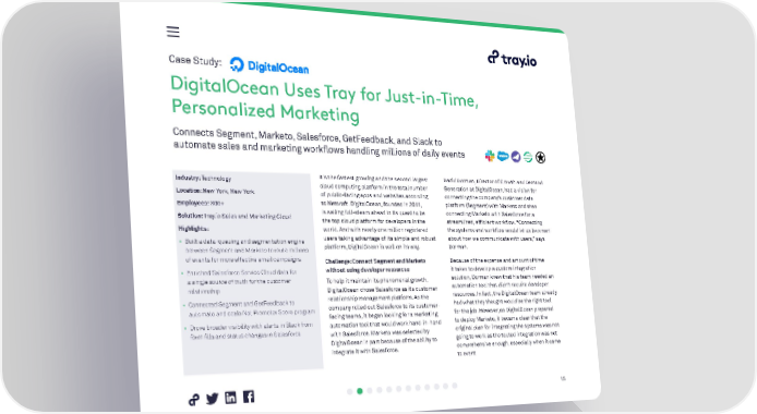 Case Study: DigitalOcean Uses Tray for Just-in-Time, Personalized Marketing Connects Segment, Marketo, Salesforce, GetFeedback, and Slack to automate sales and marketing workflows handling millions of daily events Industry: Technology It’s the fastest growing and the second largest David Dorman, Director of Growth and Demand cloud computing platform in the total number Generation at DigitalOcean, had a vision for Location: New York, New York of public-facing apps and websites according connecting the company’s customer data Employees: 300+ to Netcraft. DigitalOcean, founded in 2011, platform (Segment) with Marketo and then Solution: Tray.io Sales and Marketing Cloud is sailing full-steam ahead in its quest to be connecting Marketo with Salesforce for a the top cloud platform for developers in the streamlined, efficient workflow. “Connecting Highlights: world. And with nearly one million registered the systems and workflow would let us be smart • Built a data-queuing and segmentation engine users taking advantage of its simple and robust about how we communicate with users,” says between Segment and Marketo to route millions platform, DigitalOcean is well on its way. Dorman. of events for more effective email campaigns Challenge: Connect Segment and Marketo Because of the expense and amount of time • Enriched Salesforce Service Cloud data for without using developer resources it takes to develop a custom integration a single source of truth for the customer To help it maintain its phenomenal growth, solution, Dorman knew that his team needed an relationship DigitalOcean chose Salesforce as its customer automation tool that didn’t require developer • Connected Segment and GetFeedback to relationship management platform. As the resources. In fact, the DigitalOcean team already automate and scale Net Promoter Score program company rolled out Salesforce to its customer- had what they thought would be the right tool facing teams, it began looking for a marketing for the job. However, as DigitalOcean prepared • Drove broader visibility with alerts in Slack from automation tool that would work hand-in-hand to deploy Marketo, it became clear that the form fills and status changes in Salesforce with Salesforce. Marketo was selected by original plan for integrating the systems was not DigitalOcean in part because of the ability to going to work as the touted integration was not integrate it with Salesforce. comprehensive enough, especially when it came to event 15