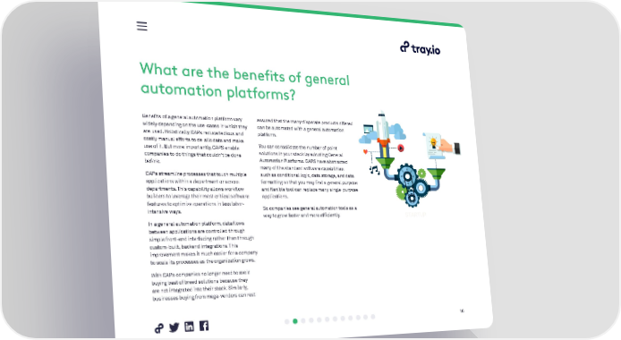 What are the benefits of general automation platforms? Benefits of a general automation platform vary assured that the many disparate products offered widely depending on the use-cases in which they can be automated with a general automation are used. Holistically, GAPs reduce tedious and platform. costly manual efforts to de-silo data and make use of it. But more importantly, GAPS enable You can consolidate the number of point companies to do things that couldn’t be done solutions in your stack by adopting General before. Automation Platforms. GAPS have abstracted many of the standard software capabilities GAPs streamline processes that touch multiple such as conditional logic, data storage, and data applications within a department or across formatting so that you may find a general purpose departments. This capability allows workflow and flexible tool can replace many single-purpose builders to leverage their most critical software applications. features to optimize operations in less labor- intensive ways. So companies see general automation tools as a way to grow faster and more efficiently. In a general automation platform, data flows between applications are controlled through simple front-end interfacing rather than through custom-built, backend integrations. This improvement makes it much easier for a company to scale its processes as the organization grows. With GAPs companies no longer need to avoid buying best of breed solutions because they are not integrated into their stack. Similarly, businesses buying from mega-vendors can rest 10