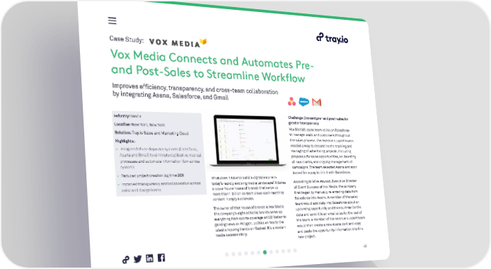 Case Study: Vox Media Connects and Automates Pre- and Post-Sales to Streamline Workflow Improves efficiency, transparency, and cross-team collaboration by integrating Asana, Salesforce, and Gmail Industry: Media Challenge: Connect pre- and post-sales for greater transparency Location: New York, New York Vox Media’s sales team relies on Salesforce Solution: Tray.io Sales and Marketing Cloud to manage leads and customers throughout Highlights: the sales process. The revenue support teams needed a way to streamline the tracking and • Integrated three disparate systems (Salesforce, managing of advertising projects, including Asana and Gmail) to eliminate duplicative, manual proposals for sales opportunities, on-boarding processes and automate information flow across of new clients, and ongoing management of systems campaigns. The team selected Asana and soon • Reduced project creation lag time 20X looked for a way to link it with Salesforce. What does it take to build a digital empire in • Improved transparency and collaboration across today’s rapidly evolving media landscape? It takes According to Mike Atwood, Executive Director sales and design teams a powerhouse house of brands that serve up of Client Success at Vox Media, the company more than 1 billion content views each month to first began by manually re-entering data from content-hungry audiences. Salesforce into Asana. A member of the sales The owner of that house of brands is Vox Media. team would add data into Salesforce about an The company’s eight editorial brands serve up upcoming opportunity and then summarize the everything from sports coverage on SB Nation to data and send it to an email alias for the rest of gaming news on Polygon, politics on Vox to the the team. A member of the revenue support team latest shopping trends on Racked. It’s a modern would then create a new Asana card and copy media success story. and paste the opportunity information into this new project. 42
