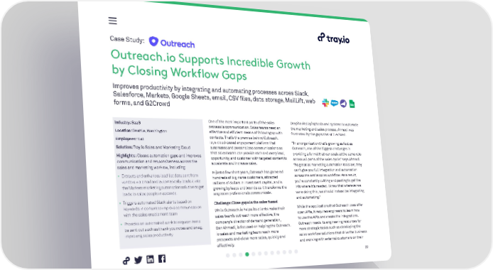 Case Study: Outreach.io Supports Incredible Growth by Closing Workflow Gaps Improves productivity by integrating and automating processes across Slack, Salesforce, Marketo, Google Sheets, email, CSV files, data storage, MailLift, web forms, and G2Crowd Industry: SaaS One of the most important parts of the sales Despite deploying tools and systems to automate process is communication. Sales teams need an the marketing and sales process, Ahmadi was Location: Seattle, Washington effective and efficient means of following up with frustrated by the gaps that still existed. Employees: 150 contacts. That’s the premise behind Outreach. io, a cloud-based engagement platform that “In an organization that’s growing as fast as Solution: Tray.io Sales and Marketing Cloud automates and personalizes communications so Outreach, one of the biggest challenges is Highlights: Closes automation gaps and improves that sales teams can provide each and every lead, providing a funnel that can scale at the same rate communication and responsiveness across the opportunity, and customer with targeted content to across all parts of the sales cycle,” says Ahmadi. accelerate and increase sales. “As great as marketing automation tools are, they sales and marketing work ow, including: In just a few short years, Outreach has garnered can’t give you full integration and automation • Extracts and enhances lead list data sent from hundreds of big-name customers, attracted across the entire sales workflow. As a result, vendors via email and automatically loads it into millions of dollars in investment capital, and is you’re constantly cutting and pasting to get the the Marketo marketing automation solution to get growing by leaps and bounds as it transforms the info where it’s needed. I knew that wherever we leads to sales people in seconds. way sales professionals communicate. were doing this, we should instead be integrating • Triggers automated Slack alerts based on and automating.” keywords in content to improve communication Challenge: Close gaps in the sales funnel with the sales enablement team While Outreach.io helps its clients make their While the applications that Outreach uses offer sales team’s outreach more effective, the open APIs, it requires engineers to learn how • Provides an automated work to request items company’s director of demand generation, to use the APIs and create the integrations. be sent out such as thank you notes and swag, Dan Ahmadi, is focused on helping the Outreach. Outreach needs its engineering resources for improving sales productivity io sales and marketing team reach more more strategic tasks such as developing the prospects and close more sales, quickly and sales workflow solutions that drive the business effectively. and working with external customers on their 22