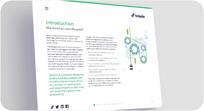Introduction Why should you read this guide? Every business wants to grow faster and spend This Beginner’s Guide to General Automation fewer resources to do so. If you’re looking for Platforms is designed to educate you on an technology trends that can deliver you an edge, this emerging new technology that has the potential to guide is for you. transform your business. It will define the category and describe the benefits to companies that are The average enterprise is using hundreds Cloud ready to grow. We’ll cover the following topics. applications, but struggles to automate processes that run across them. Similarly, the average • Why companies are now adopting General employee uses dozens of SaaS applications, yet Automation Platforms isn’t empowered to improve the processes that • How General Automation Platforms differ from fall under their purview. Until recently, automation other software categories software required scarce coding skills. But with the rise of API Integration Platforms that are designed • The common features and advanced functions of for citizen automators, a new category of software general automation tools is available to workers of many types. • How to build a business case and convince stakeholders to act General Automation Platforms • The future of General Automation Platforms enable business professionals We’ve also included worksheets that you can use to automate processes across to figure out whether your company is ready for any number of applications General Automation Platforms and how it will help and departments so that they you increase growth and productivity. can scale their growth and productivity. 3