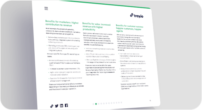 Benefits for marketers: higher Benefits for sales: increased Benefits for customer success: contribution to revenue revenue with higher happier customers, happier As an example of automation’s potential, productivity agents consider its demonstrable benefits for marketers. Sales process refinement is the most lucrative With so many customers and customer support According to Aberdeen, an analyst firm: form of enablement in modern business. channels to manage General Automation • Best-in-class marketers are 74% more likely to According to Aberdeen, sales streamliners Platforms help support professionals tame have a strongly integrated system of marketing increase company revenue at 2.2 times the the chaos by automating the flow of customer- technology solutions. rate of all other types of streamliners. Example related data. So you can spend more time with benefits include the following: customers and less time tripping over technology. • Marketing contributed 53% more to year-over- Here are just a few benefits that GAP customers year revenues for organizations using well- • Less time researching leads due to better data are seeing. integrated systems. enrichment. Here are benefits from specific marketing use • More efficient sales reps due to more qualified • Lower customer churn rates due to cases. opportunities routed more efficiently. improvements in proactive monitoring of customer health. • An increased conversion rate of marketing • More upsell potential because of better insights • More efficient customer success reps due to qualified leads (MQL) to sales qualified leads into usage and happiness of current customers. the centralization of data from many different (SQL). There are many more benefits that sales systems. • Increased sales team appointments by 13%. organizations are seeing from the adoption of • Measured improvements in customer General Automation Platforms. The only limit is satisfaction to do faster response times and • Higher email open and response rates due to your imagination for improving processes and improved personalization. inventing new ones. quality of interaction. • Save time for thousands of employees to more • Better alignment to revenue retention due efficient event management. to SLA and payment-status integration and automation. There are many potential benefits to marketers depending on how many workflows you automate Customer success doesn’t live in a silo and and the size and scale your operation. GAPs help bridge the flow of information across organizations. 11