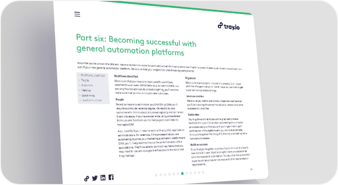 Part six: Becoming successful with general automation platforms Now that you’ve proven the ROI and made a decision to move forward with a GAP it’s time to start planning for success. Create a plan to ensure a smooth roll- out of your new general automation platform. Make sure that your project includes these key components: • Workflows identified Workflows identified Alignment • People Make sure that you have one more specific workflows Make sure that everyone involved in a process is on-board • Alignment selected to automate. While General Automation Platforms with the changes that you’d like to make. No one likes to get • Metrics are very flexible and can do almost anything, you’ll want to surprised on a process change. make sure that you focus on concrete outcomes. • Quick wins Measure metrics • Build on success People Make sure you define and communicate the metrics that Select someone to administer you GAP. While GAPs don’t you’ll be tracking. Knowing this will align everyone to what require a computer science degree, it’s helpful to pick success will look like. someone who thinks about processes logically and can break them into steps. If you have experience using spreadsheet Quick wins formulas and functions you’re likely a good candidate to You might want first to tackle the gnarliest process. manage a GAP. We think it’s lower risk to start automating less complex processes early so that you and your organization gain Also, identify if you’ll need to work with any other application confidence in the platform and your skills to automate. administrators. For example, if the process that you are Once you’ve gotten the hang of it, then try automating more automating touches your marketing automation platform and complex processes. CRM, you’ll likely want to involve the administrators of the applications. They’ll be able to point out key fields that you Build on success may need to use and also grant API access to the tools that Once that you’ve gotten a series of quick wins on the board, they manage. now is the fun part. Start looking for more processes that lend themselves to automation. You could be the automation superhero that comes to the rescue of other teammates or departments. 41