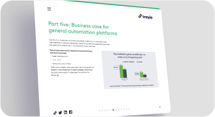 Part five: Business case for general automation platforms The return on investment of General Automation Platforms includes measurable improvements in business metrics and harder to quantify new capabilities that have the potential for step-function improvements to your business. The core business case for General Automation Platforms include the following: Top marketers grow contribution to • Faster revenue growth revenue by integrating tech • Lower costs Integrated Technologies All Others • More productive workers 32% GAPs produce faster revenue growth due to the benefits of 11% higher streamlining marketing and sales processes. Benchmark 21% studies from analyst firm Aberdeen Group show the 7.7% following: 53% higher 5.0% Contribution to Grow contribution to revenue revenue year over year Source: Aberdeen, ”The state of marketing technology: controlling the chaos” 35
