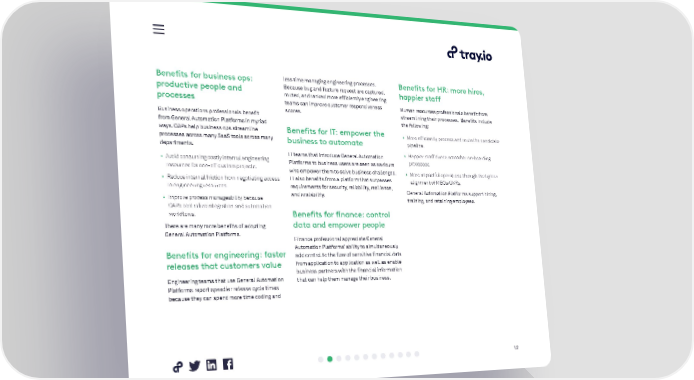 Benefits for business ops: less time managing engineering processes. Benefits for HR: more hires, productive people and Because bug and feature request are captured, happier staff processes routed, and ranked more efficiently engineering teams can improve customer responsiveness Human resources professionals benefit from Business operations professionals benefit scores. streamlining their processes. Benefits include from General Automation Platforms in myriad the following: ways. GAPs help business ops streamline Benefits for IT: empower the • More efficiently process and route the candidate processes across many SaaS tools across many business to automate pipeline. departments. IT teams that introduce General Automation • Happier staff due to smoother on-boarding • Avoid consuming costly internal engineering Platforms to business users are seen as saviours processes. resources for one-off custom projects. who empower them to solve business challenges. • More impactful operations through the tighter • Reduce internal friction from negotiating access IT also benefits from a platform that surpasses alignment of MBOs/OKRs. to engineering resources. requirements for security, reliability, resilience, and scalability. General Automation Platforms support hiring, • Improve process manageability because training, and retaining employees. GAPs centralize integration and automation workflows. Benefits for finance: control There are many more benefits of adopting data and empower people General Automation Platforms. Finance professional appreciate General Benefits for engineering: faster Automation Platforms’ ability to simultaneously add control to the flow of sensitive financial data releases that customers value from application to application as well as enable business partners with the financial information Engineering teams that use General Automation that can help them manage their business. Platforms report speedier release cycle times because they can spend more time coding and 12