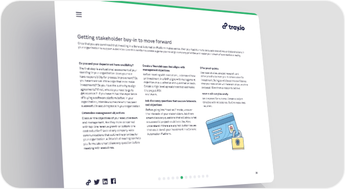 Getting stakeholder buy-in to move forward Once that you are convinced that investing in a General Automation Platform makes sense, then your task turns to persuade executives and stakeholders in your organization to support a decision. Use this section to create a game plan to align company priorities and make your dream of automation a reality. Do you and your department have credibility? Create a financial case that aligns with Offer proof-points The first step is a situational assessment of your management objectives Use case studies, analyst research, and standing in your organization. Does your role Before meeting with executives, understand how other proof to bolster your business case for have responsibility for process improvement? Do an investment in a GAP aligns with management investment. Doing so will boost the confidence you have the trust of the organization to make objective on a qualitative and quantitative basis. that your executives will have about you and the investments? Do you have the authority to sign Create a high-level spreadsheet that estimates proposal. Give them a reason to believe. agreements? If not, who do you need to go to the project ROI get approval? If you haven’t had the experience and levers. Have a roll-out plan ready of buying a software platform before in your Be prepared for success. Create a project organization, interview someone who has been Ask discovery questions that uncover interests timeline with milestones. Outline resources successful in acquiring tools in your organization. and objections required. Before going into “hard sell” mode, uncover Determine management objectives the interests of your stakeholders. Ask them Discover the objectives of your executive team smart discovery questions that will show what and management. Are they more concerned a successful project could look like. Also, with top-line revenue growth or bottom-line understand if there are any hot-button issues cost reduction? Look at any company-wide that could derail your investment in a General communications that outline the priorities for Automation Platform. your organization. A little bit of reading can help you formulate smart discovery question before meeting with executives. 38