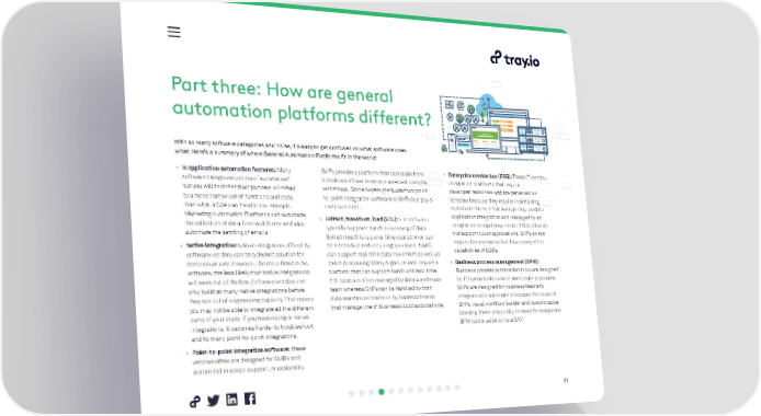 Part three: How are general automation platforms different? With so many software categories and noise, it’s easy to get confused on what software does what. Here’s a summary of where General Automation Platforms fit in the world: • In application automation features: Many GAPs provide a platform that can scale from • Enterprise service bus (ESB): These IT-centric software categories promise “automation” simple workflows to enterprise-level complex integration platforms that require but you will find that their purview is limited workflows. Some buyers graduate from point- developer resources and are perceived as to a more narrow set of functions and data to-point integration software to GAPs but pay a complex because they require maintaining than what a GAP can handle. For example, transition cost. coded interfaces. ESBs are typically used for Marketing Automation Platforms can automate • Extract, transform, load (ETL): ETL software application integration and managed by an the collection of data from web forms and also typically supports batch processing of data. integration competency center. ESBs often do automate the sending of emails. Sometimes this is a one-time operation or can not support cloud applications. GAPs do not • Native integration: Native integration offered by be a schedule and recurring operation. GAPS require Dev resources but have many of the software vendors can be a decent solution for can support real-time data movement as well as capabilities of ESBs. some situations. However, the more flexible the batch processing. Many organizations require a • Business process management (BPM): software, the less likely that native integrations platform that can support batch and real-time. Business process automation tools are designed will work out of the box. Software vendors can ETL tools are often managed by data warehouse for IT teams to document and create processes. only build so many native integrations before team whereas GAPs can be handled by both GAPs are designed for business teams to they run out of engineering capacity. That means data warehouse teams or by business teams integrate and automate processes. Because of you may not be able to integrate all the different that manage line of business cloud applications. GAPs visual workflow builder and customizable parts of your stack. If you have multiple native labeling, there is typically no need for a separate integrations, it becomes harder to troubleshoot BPM tool in addition to a GAP. and fix many point-to-point integrations. • Point-to-point integration software: these vendors often are designed for SMBs and are limited in scope, support, or scalability. 21