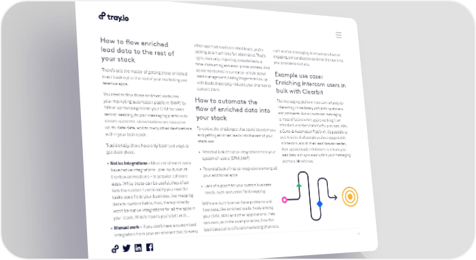 How to flow enriched other app that needs enriched leads, you’re such as chat messaging, to ensure you have an lead data to the rest of looking at a much less fun alternative. That’s engaging, personalized experience the next time right, manually importing spreadsheets, a your prospects visit you. your stack time-consuming and error-prone process. And as we mentioned in our earlier article about Example use case: There’s still the matter of getting those enriched lead management, taking longer to follow up Enriching Intercom users in leads back out to the rest of your marketing and with leads drastically reduces your chances to revenue apps. convert them. bulk with Clearbit You need to flow those enriched leads into How to automate the The messaging platform Intercom is handy for your marketing automation platform (MAP) for flow of enriched data into interacting immediately with both customers follow-up campaigns into your CRM for sales and prospects. But all customer messaging record-keeping, to your messaging platform to your stack is most effective when you’re working from ensure customer conversations are based on refreshed, enriched data that’s up to date. With up-to-date data, and to many other destinations To review, the challenges that stand between you a General Automation Platform, it’s possible to within your tech stack. and getting enriched leads into the rest of your pull in a list of all people you’ve engaged with stack are: in Intercom, enrich their lead data as needed, Traditionally, there have only been two ways to then update leads in Intercom to ensure your get them there: • Potential lack of native integrations from your lead data is in sync even within your messaging system of record (CRM, MAP) platform. Here’s how. • Native integrations - Most enrichment tools have native integrations - pre-built, out-of- • Potential lack of native integrations among all the-box connections - to popular software your additional apps apps. While these can be useful, they often lack the custom functionality you need for • Lack of support for your custom business tasks specific to your business, like mapping needs, such as custom field mapping data to custom fields. Also, there probably GAPs are built to solve these problems and won’t be native integrations for all the apps in flow data, like enriched leads, freely among your stack. Which means you’re left with... your CRM, MAP, and other applications. They • Manual work - If you don’t have a customized can even, as in the example below, flow this integration from your enrichment tool to every lead data out to different marketing channels, 11