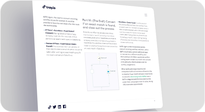 NOTE: Again, this lead-to-account-matching Part VI: (The End!) Convert • Salesforce - Convert Lead: If, as the result of workflow is just for example. It would be if an exact match is found, the previous Boolean loop, the workflow finds possible to have the next steps after this route an exact match for the lead’s company name, it the lead to sales. and close out the process then converts the lead within CRM and closes out the process. If it fails to find an exact • If “False” - Salesforce - Exact Match? Since the workflow has already determined match (after having previously failed to also [Domain]: Having failed to make a fuzzy that the lead is “worth” pursuing, that it does find a fuzzy match), it does nothing, having company match for this new lead, it then not already exist within Salesforce, and that its effectively determined that it’s not possible to performs an exact match query in Salesforce. company name does not have a fuzzy match in convert at this time. Salesforce, the workflow closes out the process • Boolean If/Then - Exact Domain Match based on whether the lead’s company name has NOTE: Again, while this example lead-to- Found?: The workflow then runs another if/ an exact match in Salesforce. account matching workflow ends here, with a then step to determine which action should be GAP, it could easily contain additional steps, taken after running an exact match query for or cascade into a different workflow, that the lead’s company in Salesforce. then continues the follow-up process, such as routing leads to sales via a round-robin process or divvied up by other business rules like territory assignments. Many rapidly-growing companies and enterprises build automated workflows like this to instantly fuzzy-match and exact-match leads to accounts. Advertising leader AdRoll uses a GAP to integrate leads from multiple sources, enrich them, and prepare them for sales, driving 13% more sales appointments. 20