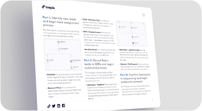 Part I: Identify new leads • FALSE - Set Owner Data: If the Boolean and begin lead assignment operator determines a “false” outcome - that the lead owner field is not set properly - it process corrects the owner field. The first steps in our journey involve identifying • TRUE - Random Number: If the Boolean an inbound lead, verifying against MAP records, operator determines a “true” outcome - that and beginning the assignment process. the lead owner field is properly set for being sales-ready - it generates a random number to decide which member of the SDR team gets the lead assignment. • Workflow Branch: This branching helper then • Data Helper - Load Owner Data: Next, the opens up branching logic to account for the workflow, having determined the owner of this multiple members of the SDR team. lead, loads the owner’s identity to transfer into outbound sequencing, in this case, provided by Part II: Round Robin Outreach. leads to SDRs and begin • Outreach - Find Prospect: Next, the workflow outbound process loads the lead owner into Outreach and locates that lead’s data within the Outreach platform. • Webhook: The process starts with a webhook- The next leg of this automated workflow based trigger that begins whenever a new lead assigns the lead to the appropriate SDR, then Part III: Confirm lead exists is captured and validates it against records automatically kicks off the outbound email in sequencing and begin within the marketing platform. sequencing process. outbound outreach • Data Helper - Assign to: These steps in the • Boolean If/Then: The workflow then workflow branch accept the data from the The final part of this automated GAP workflow determines whether the owner field for the Random Number helper in our previous steps. briefly determines whether this lead’s lead is properly filled out at sales-ready Depending on the random number generated, information exists in Outreach, then places the status. the lead either gets assigned to SDR Jack or lead into a sequence to begin outbound. SDR Jill. 23