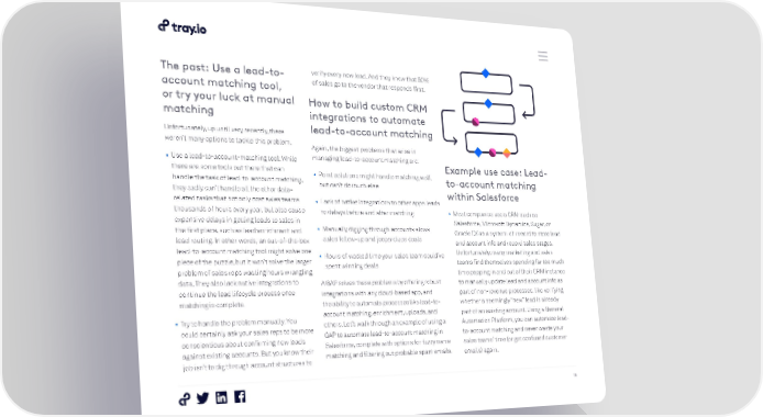The past: Use a lead-to- verify every new lead. And they know that 50% account matching tool, of sales go to the vendor that responds first. or try your luck at manual How to build custom CRM matching integrations to automate Unfortunately, up until very recently, there lead-to-account matching weren’t many options to tackle this problem. Again, the biggest problems that arise in • Use a lead-to-account-matching tool: While managing lead-to-account matching are: Example use case: Lead- there are some tools out there that can • Point solutions might handle matching well, handle the task of lead-to-account matching, but can’t do much else to-account matching they sadly can’t handle all the other data- within Salesforce related tasks that not only cost sales teams • Lack of native integrations to other apps leads thousands of hours every year, but also cause to delays before and after matching • Most companies use a CRM such as expensive delays in getting leads to sales in Salesforce, Microsoft Dynamics, Sugar, or the first place, such as lead enrichment and • Manually digging through accounts slows Oracle CX as a system-of-record to store lead lead routing. In other words, an out-of-the-box sales follow-up and jeopardizes deals and account info and record sales stages. lead-to-account matching tool might solve one • Hours of wasted time your sales team could’ve Unfortunately, many marketing and sales piece of the puzzle, but it won’t solve the larger spent winning deals teams find themselves spending far too much problem of sales reps wasting hours wrangling time popping in and out of their CRM instance data. They also lack native integrations to A GAP solves these problems by offering robust to manually update lead and account info as continue the lead lifecycle process once integrations with any cloud-based app, and part of non-revenue processes, like verifying matching is complete. the ability to automate processes like lead-to- whether a seemingly “new” lead is already • Try to handle the problem manually: You account matching, enrichment, uploads, and part of an existing account. Using a General could certainly ask your sales reps to be more others. Let’s walk through an example of using a Automation Platform, you can automate lead- conscientious about confirming new leads GAP to automate lead-to-account matching in to-account matching and never waste your against existing accounts. But you know their Salesforce, complete with options for fuzzy name sales teams’ time (or get confused customer job isn’t to dig through account structures to matching and filtering out probable spam emails. emails) again. 16