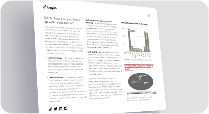 OK. So how can you follow • Lead segmentation (scoring, account up with leads faster? matching) - Ideally, marketers use some kind of filtering process (or processes) to segment Follow-up is one of the most important parts of leads before follow-up. This can include a lead’s lifecycle, which starts after the initial steps such as scoring to identify the hottest capture in any campaign, and ends once the leads for sales, or lead-to-account matching lead is either converted to an opportunity or to match new leads to existing accounts to routed to some other appropriate follow-up. ensure sales teams don’t waste their time But along the way, marketers need to perform chasing leads from accounts already in play. crucial operations to get leads ready for follow- These processes increase sales productivity up. Each of these operations comes with its own and mean a higher win rate overall. important steps - and its own baggage that can • Lead routing - After your leads are properly slow down the process: segmented, operations professionals need to • Lead list uploads - After capturing leads from route the hottest leads to their sales teams. After matching leads to accounts, marketers Not all firms respond quickly enough to leads. any source, marketers first need to upload their leads to their system of record, such as can then assign the hottest leads to sales their marketing automation platform (MAP) team members that own those accounts, route to set the stage for follow-up and additional warm leads to sales development reps (SDR) campaigns. for outbound follow-up, or send cooler leads to nurture programs. • Lead enrichment - Once leads are loaded into the system, marketers need to ensure Every step in this lifecycle is important. each lead is fully-formed and contains Unfortunately, many marketing teams sufficient data for follow-up. (The hottest experience challenges at one stage or another. lead in the world isn’t actionable if it’s Breakages at any of these stages can lead to missing key information like company, title or painful delays that make you less likely to ever phone number.) Ideally, this also includes a speak with a decision maker, and make it even seamless transfer of lead data from your MAP harder for your sales team to turn those costly to your CRM. leads into closed-won deals. Only about half of marketers are actually taking action on integrating their data. 4