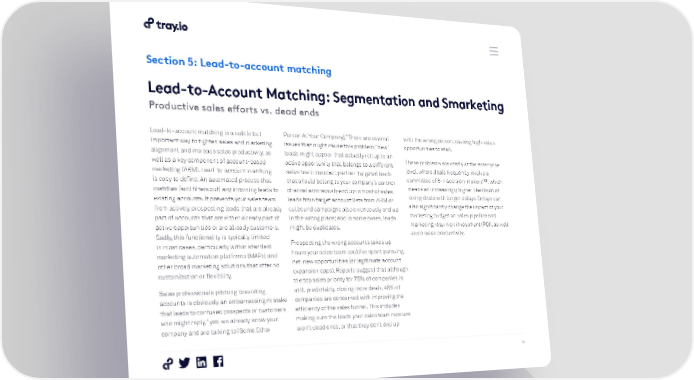 Section 5: Lead-to-account matching Lead-to-Account Matching: Segmentation and Smarketing Productive sales efforts vs. dead ends Lead-to-account matching is a subtle but Person At Your Company].” There are several with the wrong person, causing high-value important way to tighten sales and marketing issues that might cause this problem: “new” opportunities to stall. alignment and increase sales productivity, as leads might appear that actually roll up to an well as a key component of account-based active opportunity that belongs to a different These problems are costly at the enterprise marketing (ABM). Lead-to-account matching sales team member; partner-targeted leads level, where deals frequently involve a [13] is easy to define: An automated process that that should belong to your company’s partner committee of 6-7 decision-makers , which matches (and filters out) any incoming leads to channel erroneously end up in front of sales; means an increasingly higher likelihood of existing accounts. It prevents your sales team leads from target account lists from ABM or losing deals with longer delays. Delays can from actively prospecting leads that are already outbound campaigns also erroneously end up also significantly change the impact of your part of accounts that are either already part of in the wrong place; and in some cases, leads marketing budget on sales pipeline and active opportunities or are already customers. might be duplicates. marketing return on investment (ROI), as well Sadly, this functionality is typically limited as on sales productivity. in most cases, particularly within standard Prospecting the wrong accounts takes up marketing automation platforms (MAPs) and hours your sales team could’ve spent pursuing other broad marketing solutions that offer no net-new opportunities (or legitimate account customization or flexibility. expansion opps). Reports suggest that although the top sales priority for 75% of companies is Sales professionals pitching to existing still, predictably, closing more deals, 48% of accounts is obviously an embarrassing mistake companies are concerned with improving the that leads to confused prospects or customers efficiency of the sales funnel. This includes who might reply, “yes, we already know your making sure the leads your sales team receives company and are talking to [Some Other aren’t dead ends, or that they don’t end up 14