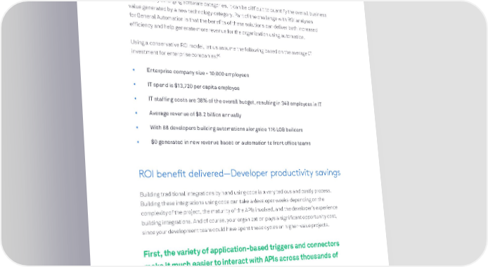 Building a business case— the ROI of General Automation As with many emerging software categories, it can be difficult to quantify the overall business value generated by a new technology category. Part of the challenge with ROI analyses for General Automation is that the benefits of these solutions can deliver both increased efficiency and help generate more revenue for the organization using automation. Using a conservative ROI model, let us assume the following based on the average IT [4] investment for enterprise companies: • Enterprise company size - 10,000 employees • IT spend is $13,720 per capita employee • IT staffing costs are 38% of the overall budget, resulting in 348 employees in IT • Average revenue of $8.2 billion annually • With 88 developers building automations alongside 176 LOB builders • $0 generated in new revenue based on automation to front office teams ROI benefit delivered—Developer productivity savings Building traditional integrations by hand using code is a very tedious and costly process. Building these integrations using code can take a developer weeks depending on the complexity of the project, the maturity of the APIs involved, and the developer’s experience building integrations. And of course, your organization pays a significant opportunity cost, since your development team could have spent those cycles on higher-value projects. First, the variety of application-based triggers and connectors make it much easier to interact with APIs across thousands of applications and databases.