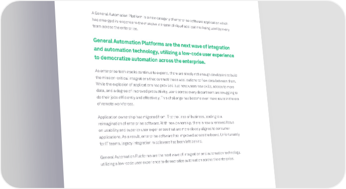 What are general automation platforms? A General Automation Platform is a new category of enterprise software application which has emerged in response to the massive increase of cloud applications being used by every team across the enterprise. General Automation Platforms are the next wave of integration and automation technology, utilizing a low-code user experience to democratize automation across the enterprise. As enterprise tech stacks continue to expand, there are simply not enough developers to build the mission-critical integrations that connect these applications to flow data between them. While the explosion of applications has provided business users new skills, access to more data, and a degree of improved productivity, users across every department are struggling to do their jobs efficiently and effectively. This challenge has become even more acute in the era of remote workforces. Application ownership has migrated from IT to the lines of business, leading to a reimagination of enterprise software. With new ownership, there is now a renewed focus on usability and superior user experiences that are more closely aligned to consumer applications. As a result, enterprise software has improved across the board. Unfortunately for IT teams, legacy integration middleware has been left behind. General Automation Platforms are the next wave of integration and automation technology, utilizing a low-code user experience to democratize automation across the enterprise.