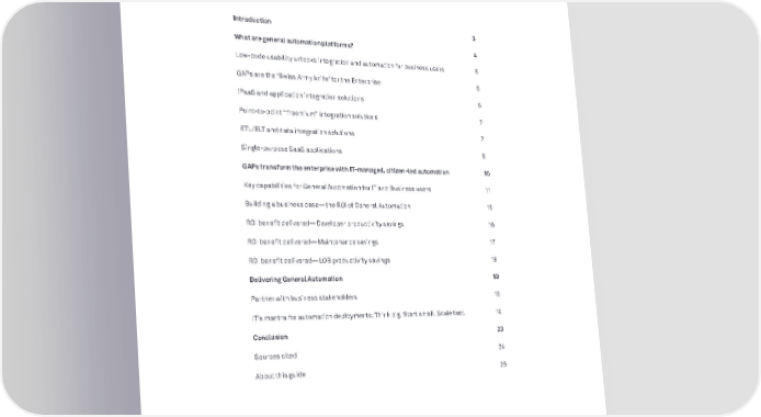 TABLE OF CONTENTS Introduction 3 What are general automation platforms? 4 Low-code usability unlocks integration and automation for business users 5 GAPs are the ‘Swiss Army knife’ for the Enterprise 5 iPaaS and application integration solutions 6 Point-to-point “freemium” integration solutions 7 ETL/ELT and data integration solutions 7 Single-purpose SaaS applications 8 GAPs transform the enterprise with IT-managed, citizen-led automation 10 Key capabilities for General Automation for IT and Business users 11 Building a business case—the ROI of General Automation 15 ROI benefit delivered—Developer productivity savings 16 ROI benefit delivered—Maintenance savings 17 ROI benefit delivered—LOB productivity savings 18 Delivering General Automation 19 Partner with business stakeholders 19 IT’s mantra for automation deployments: Think big. Start small. Scale fast. 19 Conclusion 23 Sources cited 24 About this guide 25