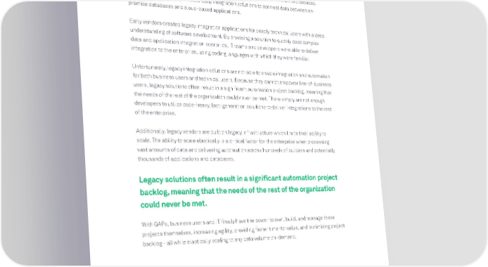 iPaaS and application integration solutions Integration-focused software applications have been around for more than two decades. Legacy vendors initially created early integration solutions to connect data between on- premise databases and cloud-based applications. Early vendors created legacy integration applications for deeply technical users with a deep understanding of software development. By providing a solution to quickly code complex data and application integration scenarios, IT teams and developers were able to deliver integration to the enterprise, using coding languages with which they were familiar. Unfortunately, legacy integration solutions are not able to enable integration and automation for both business users and technical users. Because they cannot empower line-of-business users, legacy solutions often result in a significant automation project backlog, meaning that the needs of the rest of the organization could never be met. There simply are not enough developers to utilize code-heavy, last-generation solutions to deliver integrations to the rest of the enterprise. Additionally, legacy vendors are built on legacy infrastructure which limits their ability to scale. The ability to scale elastically is a critical factor for the enterprise when processing vast amounts of data and delivering automation across hundreds of builders and potentially thousands of applications and databases. Legacy solutions often result in a significant automation project backlog, meaning that the needs of the rest of the organization could never be met. With GAPs, business users and IT finally have the power to own, build, and manage these projects themselves, increasing agility, providing faster time-to-value, and minimizing project backlog - all while elastically scaling to any data volume on-demand.