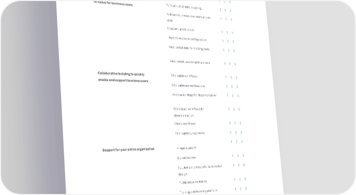 Requirements for IT leaders Functional capability Rating Modern, low-code UX and usability Visual workflow builder 1 2 3 features to easily deliver rapid time- Point and click data mapping 1 2 3 to-value for business users Rollback to previous versions in one- 1 2 3 click Copy and paste steps 1 2 3 Human-readable configuration 1 2 3 Abstracted data formatting tools 1 2 3 Abstracted JavaScript functions 1 2 3 Collaborative building to quickly Shareable workflows 1 2 3 enable and support business users Shareable authentications 1 2 3 Annotated steps for documentation 1 2 3 Annotated workflows for 1 2 3 documentation Clone workflows 1 2 3 Shareable components 1 2 3 1 2 3 Support for your entire organization In-app support Global support 1 2 3 Solutions architects for automation 1 2 3 design Public documentation 1 2 3 Training and learning platform 1 2 3