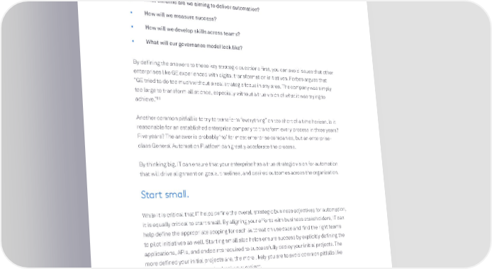 Key questions to answer: • What is the core goal of the organization deploying automation — to drive productivity or growth? • What timeline are we aiming to deliver automation? • How will we measure success? • How will we develop skills across teams? • What will our governance model look like? By defining the answers to these key strategic questions first, you can avoid issues that other enterprises like GE experienced with digital transformation initiatives. Forbes argues that “GE tried to do too much without a real strategic focus in any area. The company was simply too large to transform all at once, especially without a true vision of what it was trying to achieve.”[1] Another common pitfall is to try to transform “everything” on too short of a time horizon. Is it reasonable for an established enterprise company to transform every process in three years? Five years? The answer is probably ‘no’ for most enterprise companies, but an enterprise- class General Automation Platform can greatly accelerate the process. By thinking big, IT can ensure that your enterprise has a true strategic vision for automation that will drive alignment on goals, timelines, and desired outcomes across the organization. Start small. While it is critical that IT helps define the overall strategic business objectives for automation, it is equally critical to start small. By aligning your efforts with business stakeholders, IT can help define the appropriate scoping for each automation use case and find the right teams to pilot initiatives as well. Starting small also helps ensure success by explicitly defining the applications, APIs, and endpoints required to successfully deploy your initial projects. The more defined your initial projects are, the more likely you are to avoid common pitfalls like “scope creep” which can easily derail your project. In order to ensure success with initial projects, we recommend you request a proof of concept for your initial projects (or better still, a trial account if available). Being able to test in