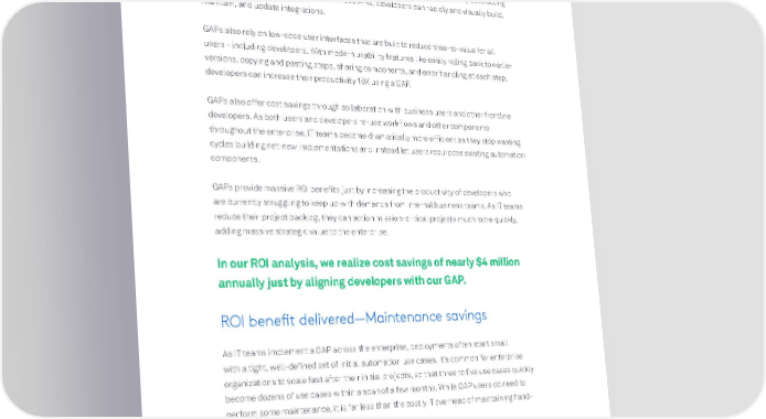 With a General Automation Platform, developers benefit in a variety of ways with this new technology. First, the variety of application-based triggers and connectors make it much easier to interact with APIs across thousands of applications and databases. By abstracting away many of the complex nuances of these APIs, developers can rapidly and visually build, maintain, and update integrations. GAPs also rely on low-code user interfaces that are built to reduce time-to-value for all users - including developers. With modern usability features like easily rolling back to earlier versions, copying and pasting steps, sharing components, and error handling at each step, developers can increase their productivity 10X using a GAP. GAPs also offer cost savings through collaboration with business users and other frontline developers. As both users and developers re-use workflows and other components throughout the enterprise, IT teams become dramatically more efficient as they stop wasting cycles building net-new implementations and instead let users repurpose existing automation components. GAPs provide massive ROI benefits just by increasing the productivity of developers who are currently struggling to keep up with demands from internal business teams. As IT teams reduce their project backlog, they can action mission-critical projects much more quickly, adding massive strategic value to the enterprise. In our ROI analysis, we realize cost savings of nearly $4 million annually just by aligning developers with our GAP. ROI benefit delivered—Maintenance savings As IT teams implement a GAP across the enterprise, deployments often start small with a tight, well-defined set of initial automation use cases. It’s common for enterprise organizations to scale fast after their initial projects, so that three to five use cases quickly become dozens of use cases within a span of a few months. While GAP users do need to perform some maintenance, it is far less than the costly IT overhead of maintaining hand- coded integrations. Maintaining hand-coded integrations is particularly painful just due to the sheer volume of integrations the modern enterprise requires to be successful and efficient. Maintenance